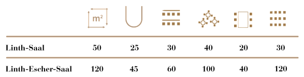The Linth Hall covers an overall area of 50 m² and is suitable for participants or guests of up to 30 people. In combination with the neighbouring room, the Linth-Escher- Hall offers a room size of 120 m² and can be occupied by 100 to 120 people.
