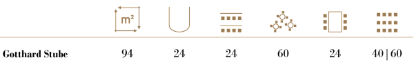 Open the mind to unconventional ideas and surprising solutions: our modern Gotthard Stube on the first floor impresses with natural colors and materials. The light-filled, multifunctional room creates an inspiring atmosphere and features a balcony overlooking the legendary Bahnhofstrasse. Equipped with modern seminar technology, soundproof windows, and air conditioning, the 94 m² space is ideal for events of up to 40 guests.