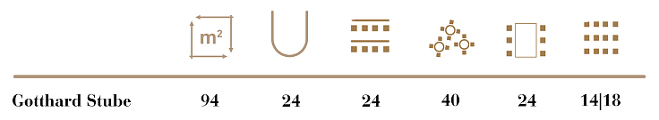 The Escher Hall measures 33 m² and is suitable for participants or guests of up to 24 people. In combination with the adjoining room, the Linth-Escher Hall covers an area of 120 m² and can accommodate 100 to 120 people.