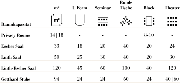 The Linth Hall covers an overall area of 50 m² and is suitable for participants or guests of up to 30 people. In combination with the neighbouring room, the Linth-Escher- Hall offers a room size of 120 m² and can be occupied by 100 to 120 people.